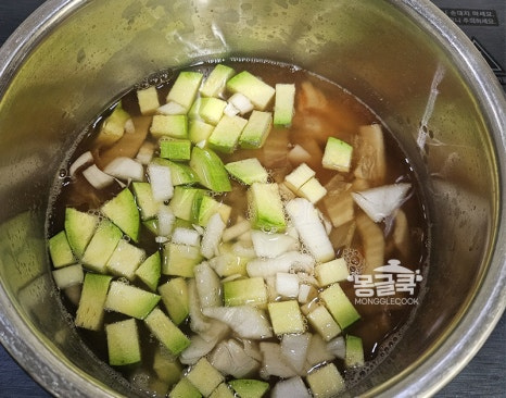 물이 끓으면 김치, 양파, 애호박(또는 무)을 먼저 넣고 3~4분 정도 끓여 주세요.