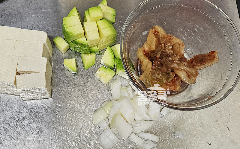 김치는 잘게 썰어 준비하고, 두부는 1~1.5cm 크기로 깍둑 썰어주세요.