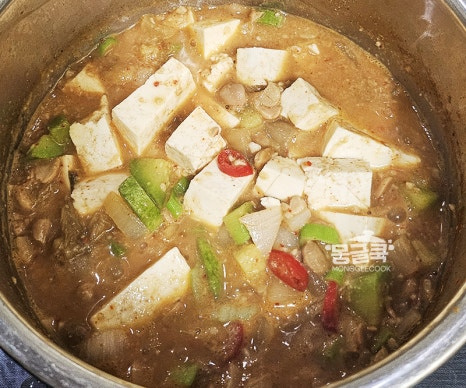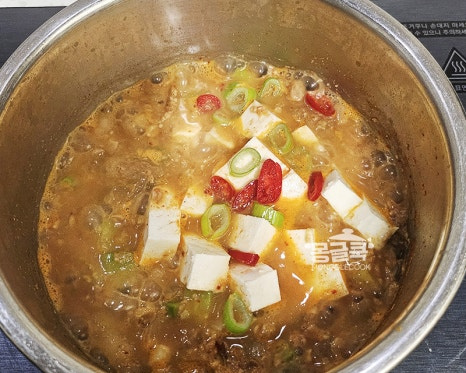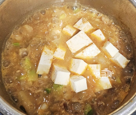 국물이 한소끔 끓어오르면 깍둑 썬 두부, 송송 썬 대파, 청양고추를 넣어 한 번 더 끓여주세요.