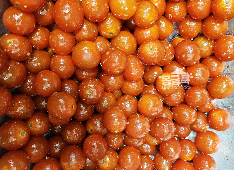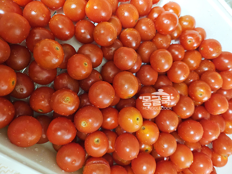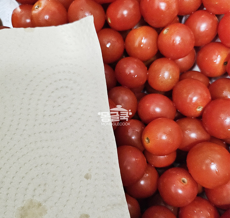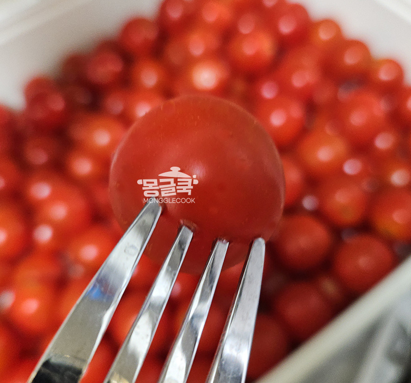 방울토마토는 깨끗이 씻은 후 물기를 제거하고, 포크로 1~2번 콕 찔러줍니다.