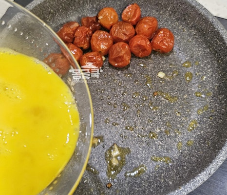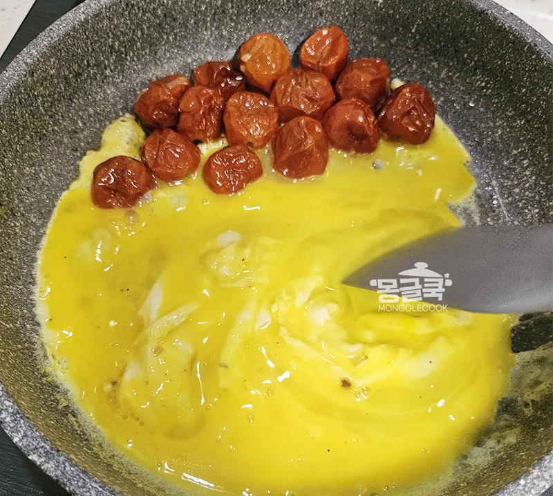 이제 토마토를 한쪽으로 밀어두고 빈 공간에 계란물을 부어주세요.