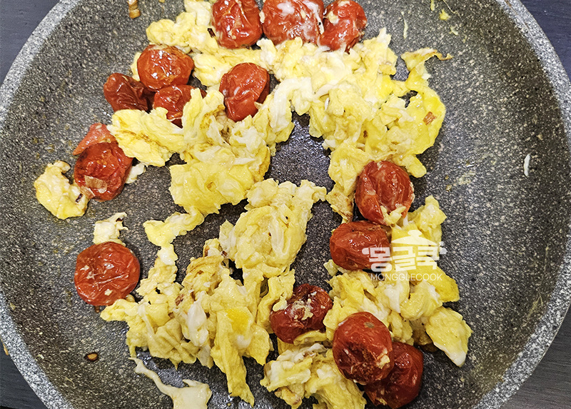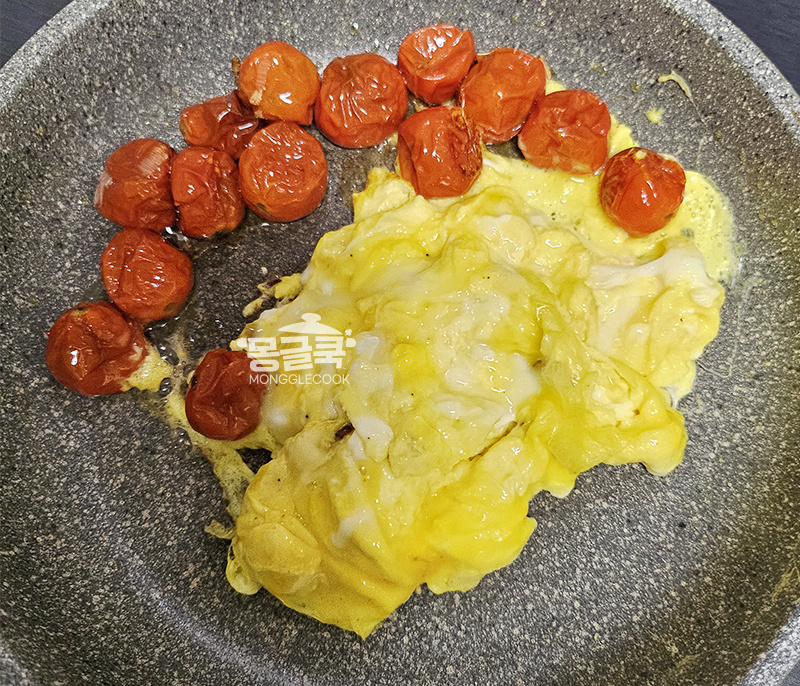 너무 익히지 않고 80% 정도만 익었을 때 토마토와 섞어 불을 꺼주세요
