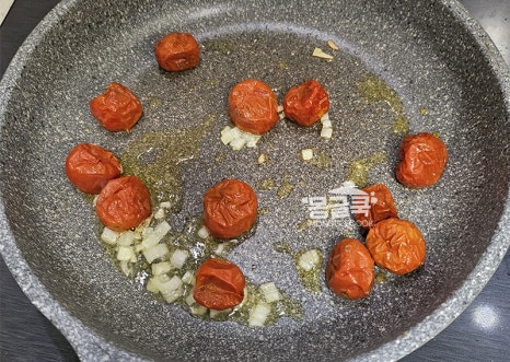 파가 노릇해지면 구운 토마토를 넣고 센 불에서 30초 정도만 살짝 볶아 따뜻하게 만들어 주세요.