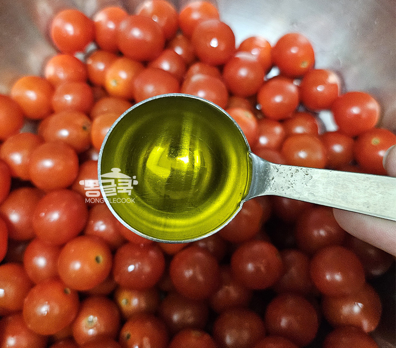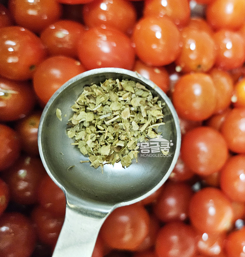 토마토에 올리브오일 2~3큰술을 넣어 골고루 버무린 뒤, 건조 오레가노 1/2작은술을 넣어주세요.