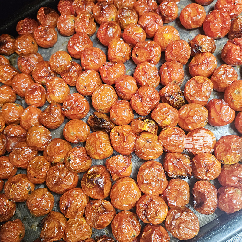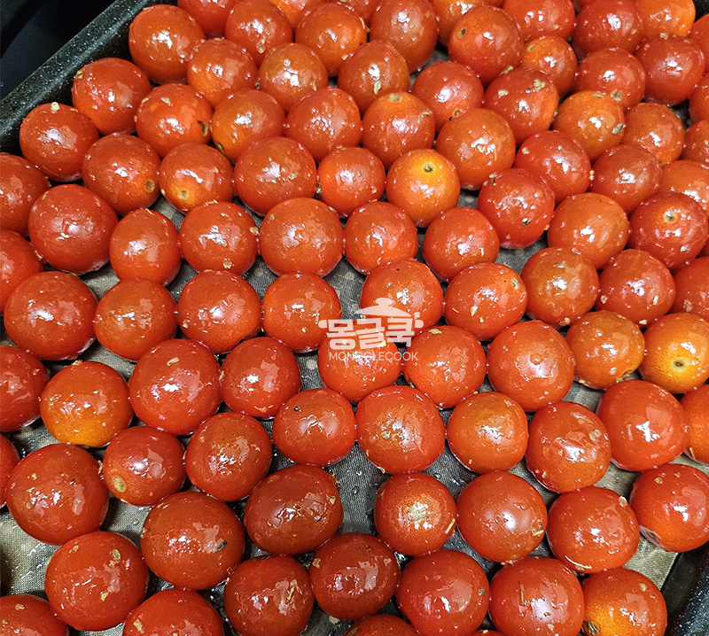 양념한 토마토를 겹치지 않게 오븐 팬에 펼쳐 올리고,