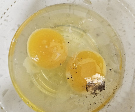 볼에 계란 2개를 깨서 풀고 소금 한꼬집, 후추 약간, 맛술 1/2작은술을 넣어 잘 섞어주세요.