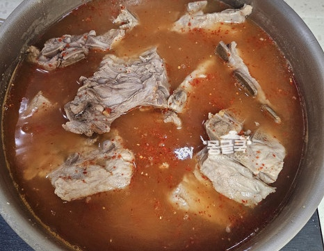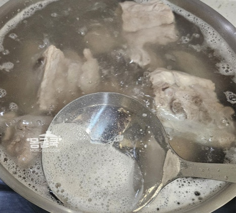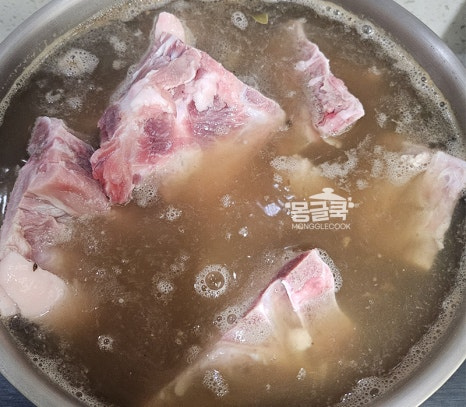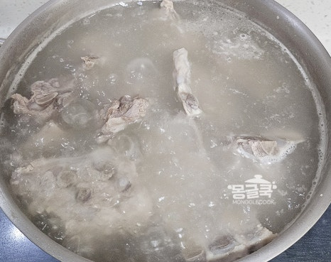 등뼈를 센 불에서 끓이다가 중약불로 줄여 1시간에서 1시간 30분 정도 푹 끓여주세요.