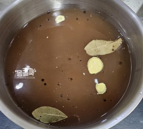 된장 1큰술, 소주/맛술, 통후추, 월계수잎 , 생강 등을 넣고 센 불에서 끓여주세요.