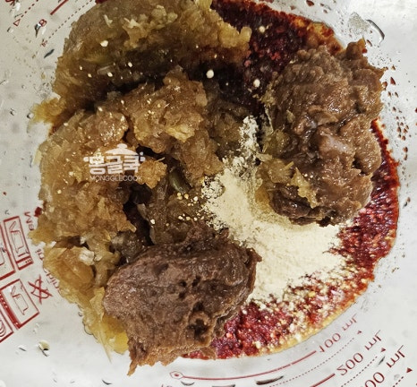 고춧가루 3~5큰술 (매운맛 기호에 따라 조절), 된장 2~3큰술, 다진 마늘 2~3큰술