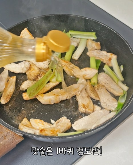 얇게 잘라준 닭을 열심히 구워주다가 닭의 잡내를 잡기 위해 맛술을 한바퀴 둘러줍니다.