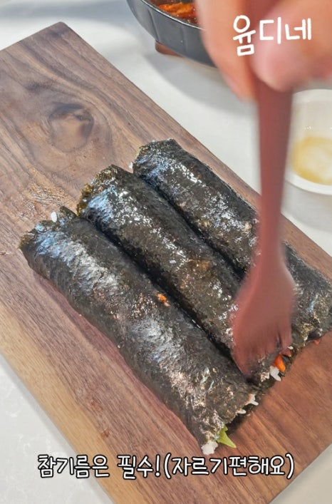 윗면에는 반드시 참기름을 발라주세요!! 바르는 이유는 칼질 때문인데요 기름으로 칠이 되어 있어야 자를 때 김이 밀리지 않아서 이쁘게 잘립니다!