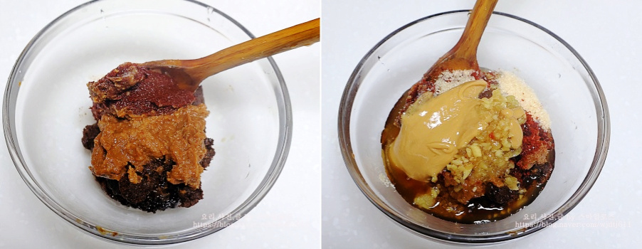 된장 3스푼에 고추장 1스푼, 고춧가루 1스푼, 땅콩소스 2스푼을 넣고