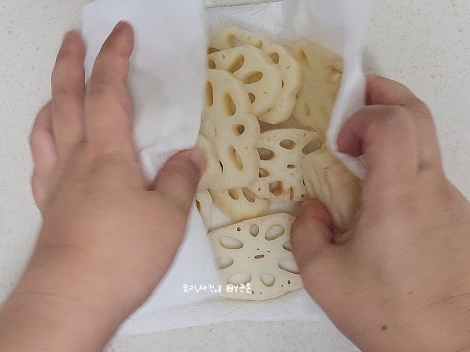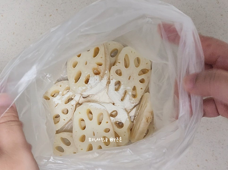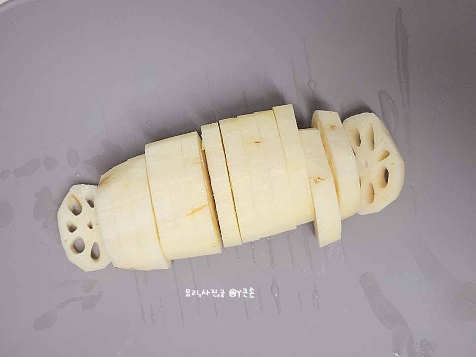 데치지 않으실 거라면 0.3cm 정도로 썰어주세요. 식초물에 담갔다가 부쳐주세요.