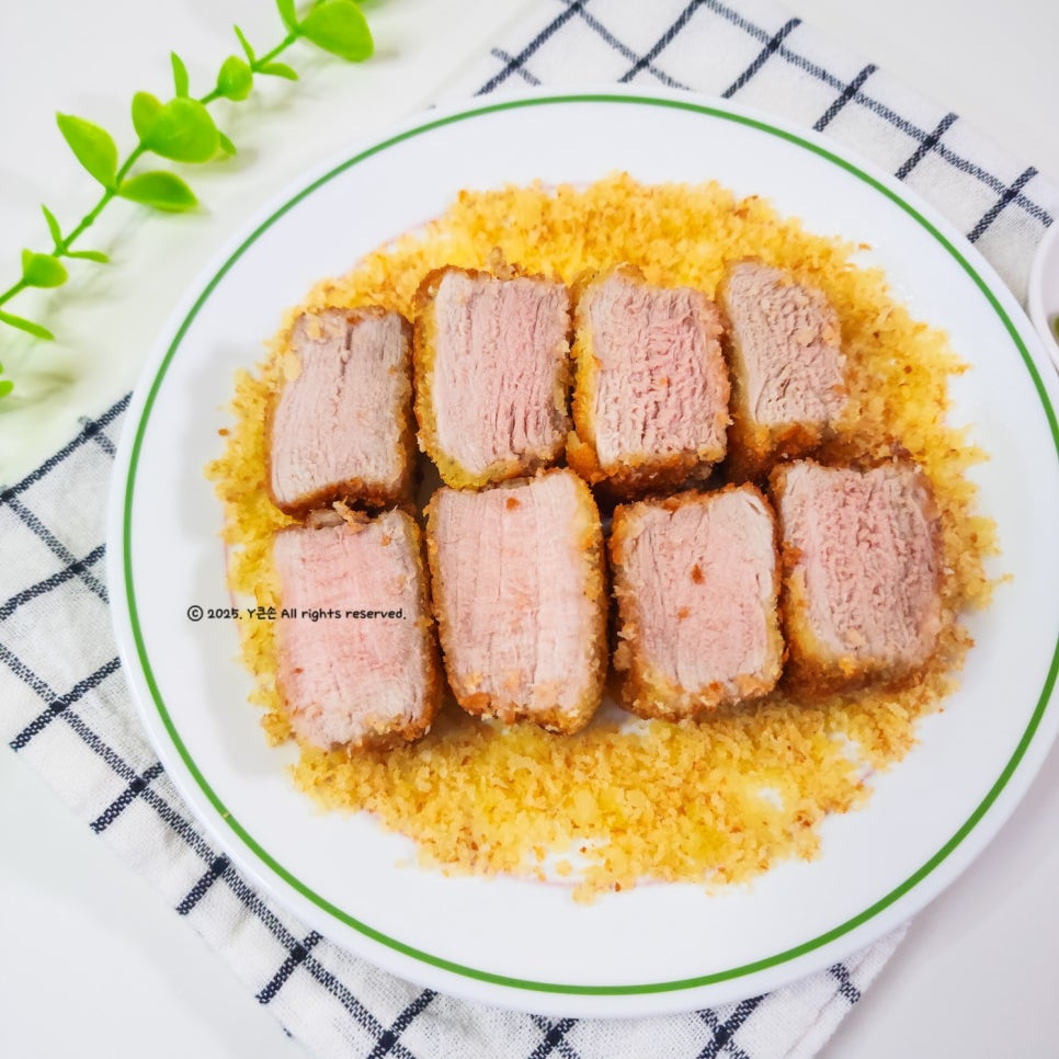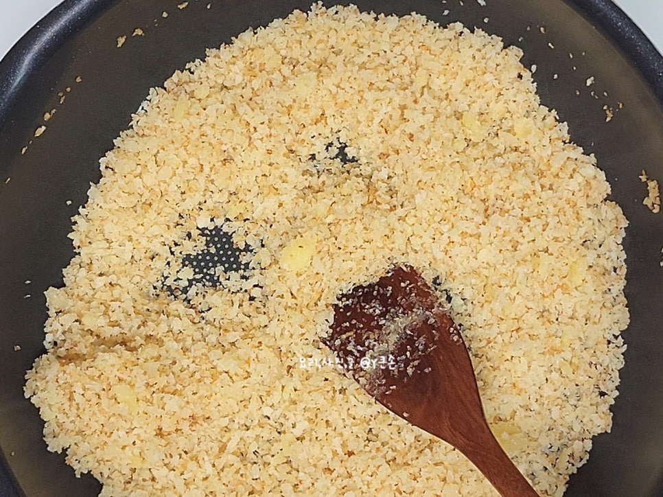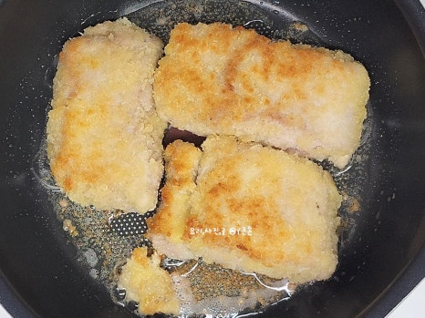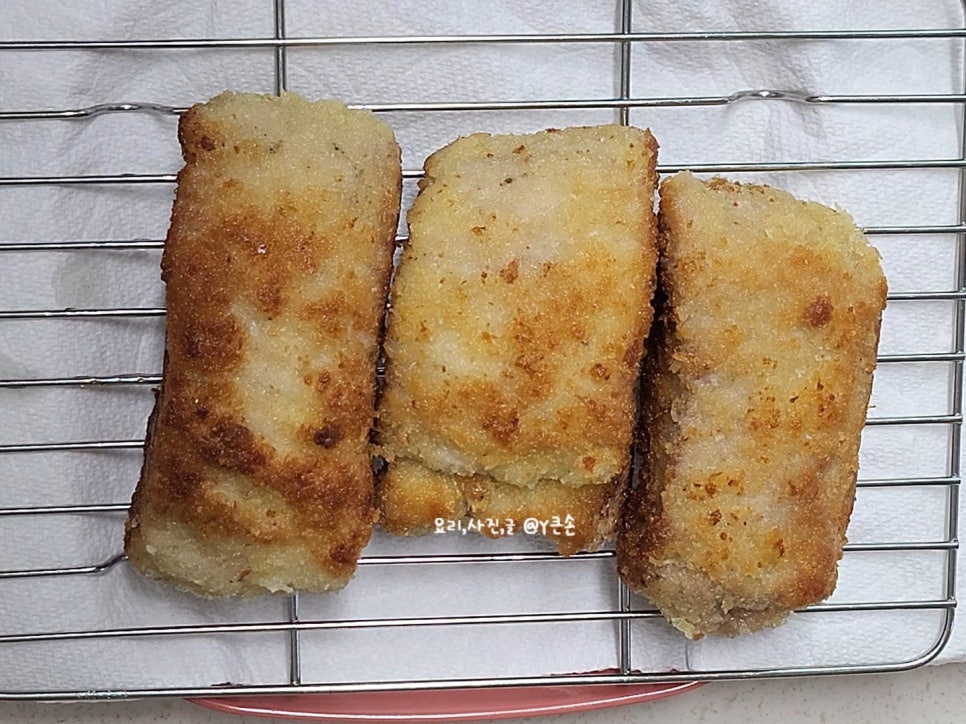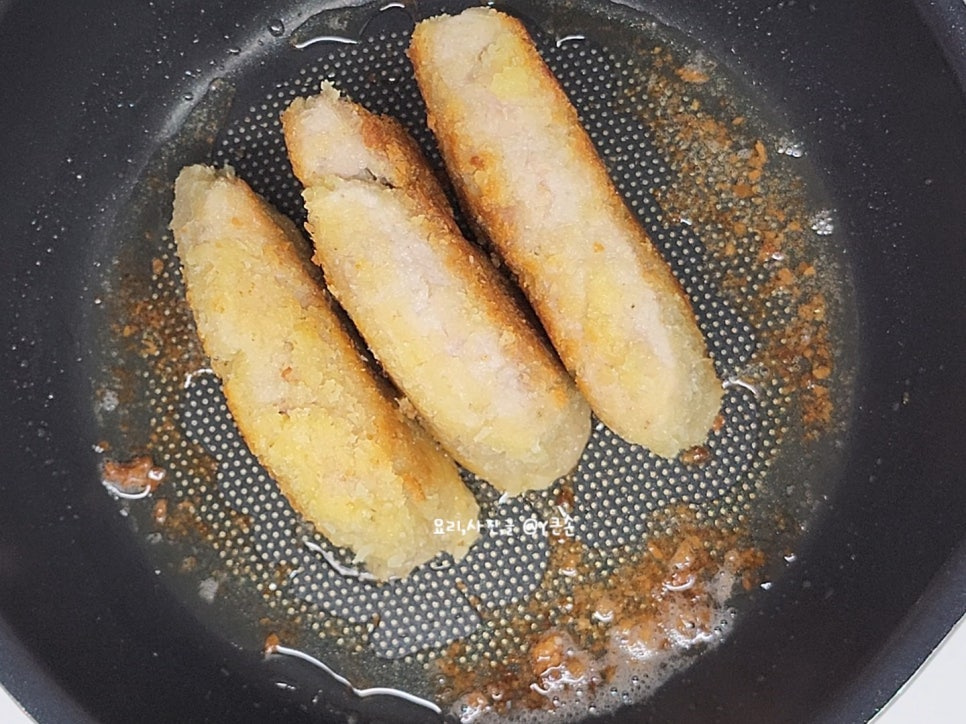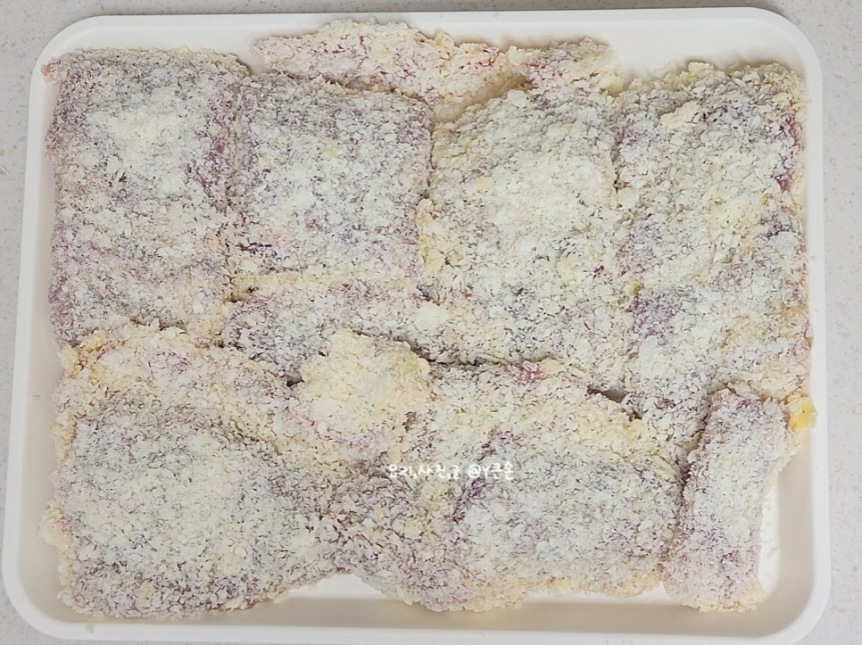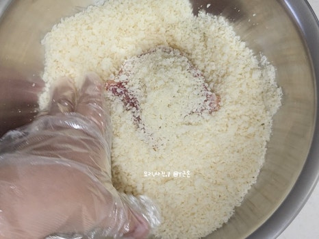 빵가루는 손으로 꾹꾹 눌러줘야 튀길 때 떨어지지 않고 바삭해져요.