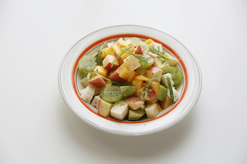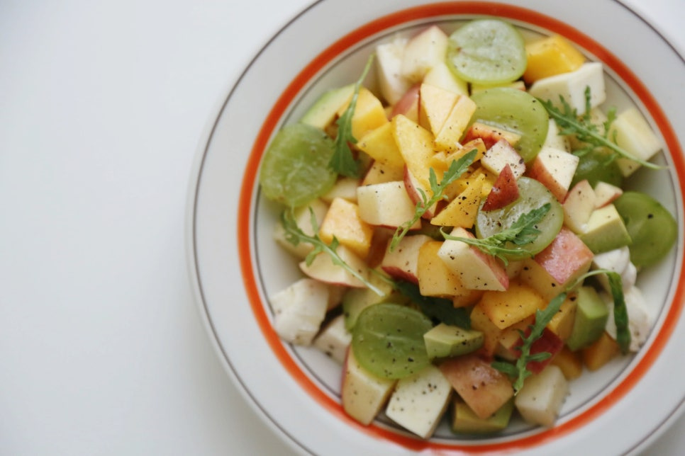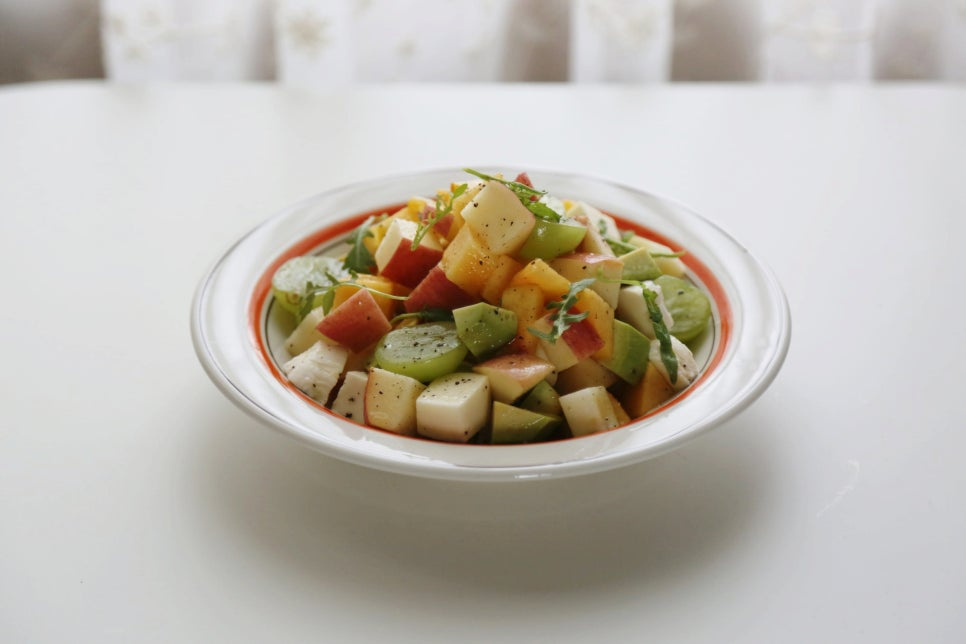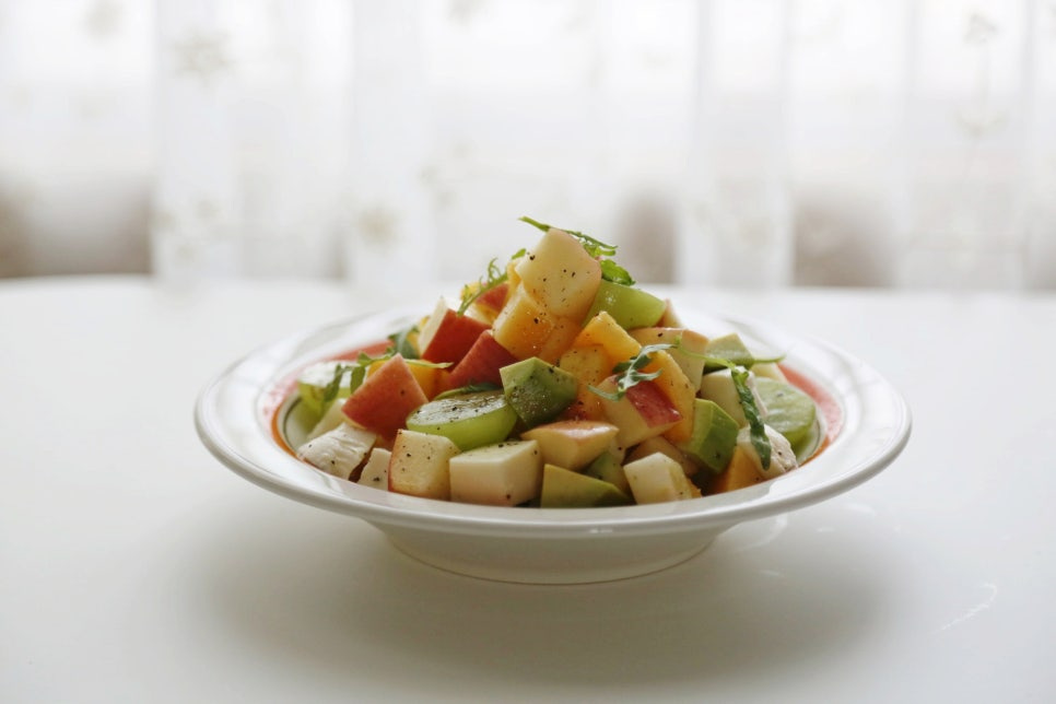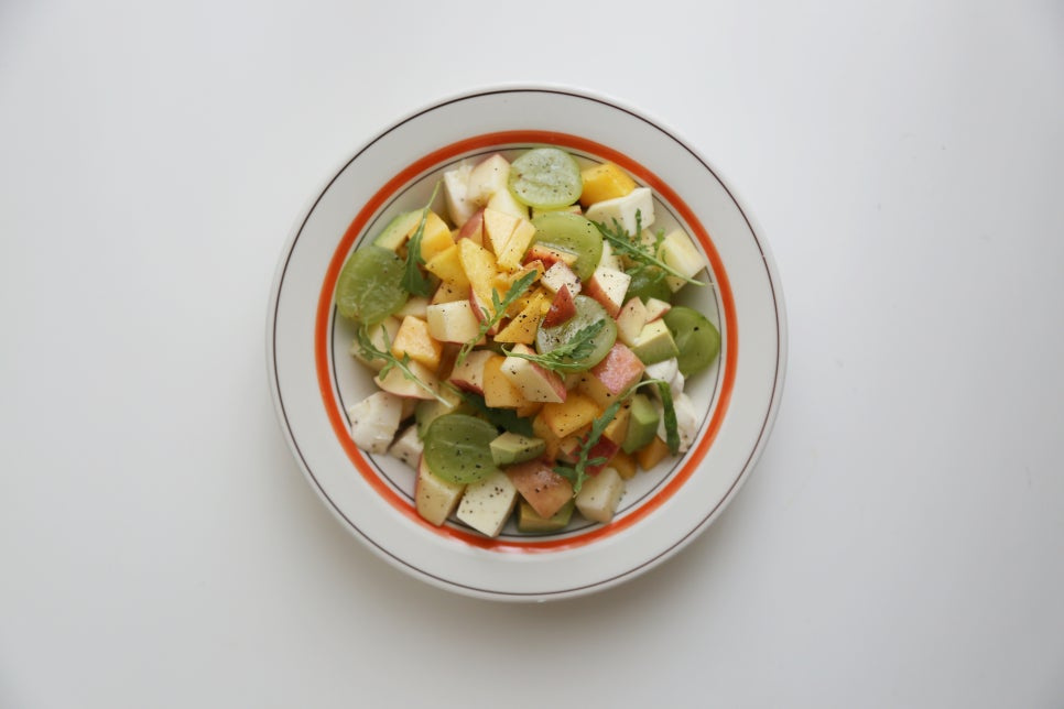 아보카도 1/2개, 사과 1/2개, 복숭아 1/2개, 샤인머스켓 4개, 생모짜렐라치즈 1개