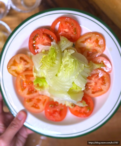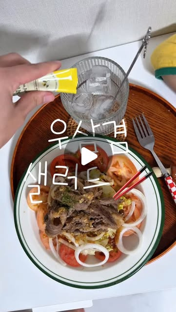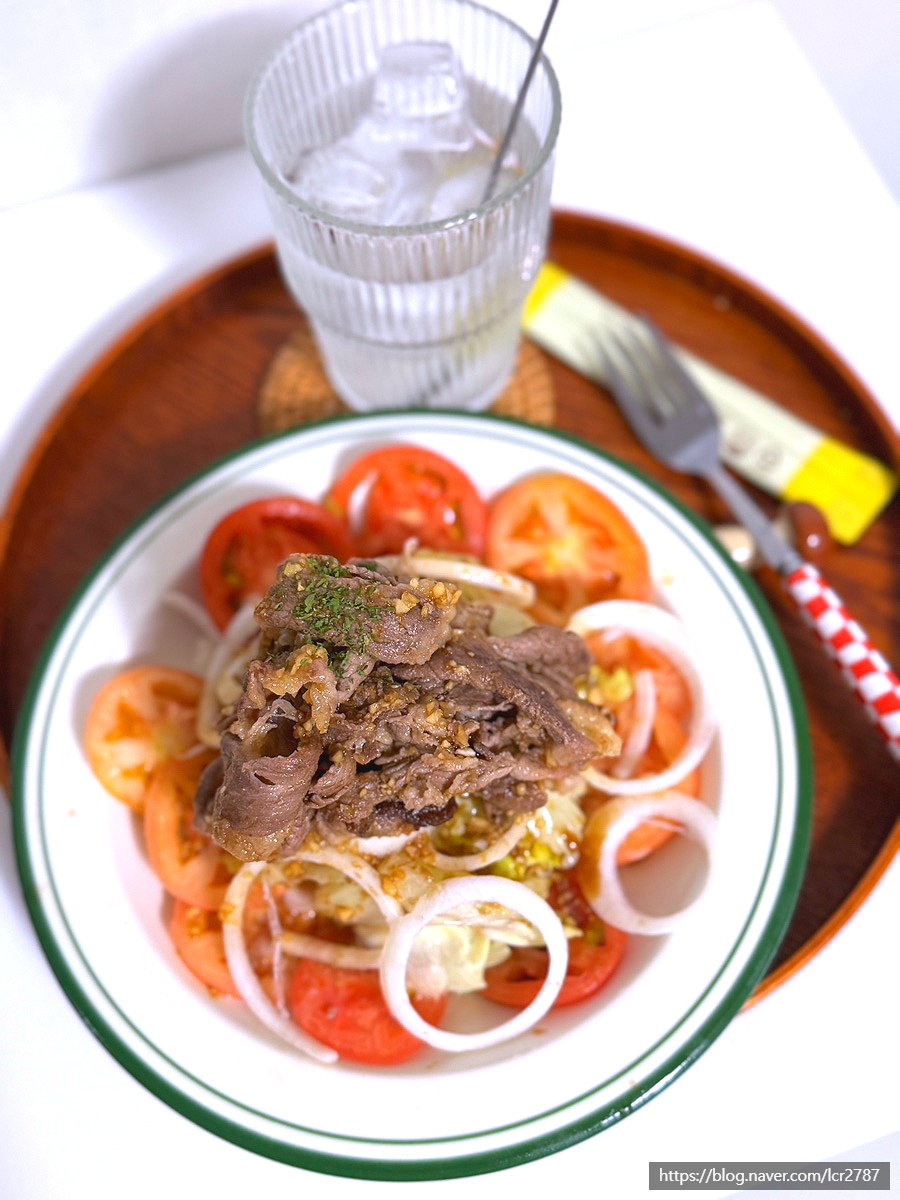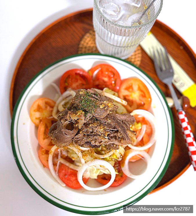 플레이팅 해주세요.넓은 접시에 토마토 양상추 양파 우삼겹 순서로 겹겹이 올려주세요.