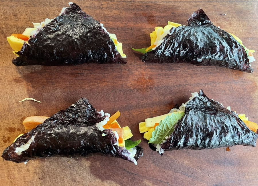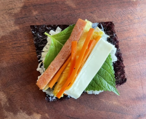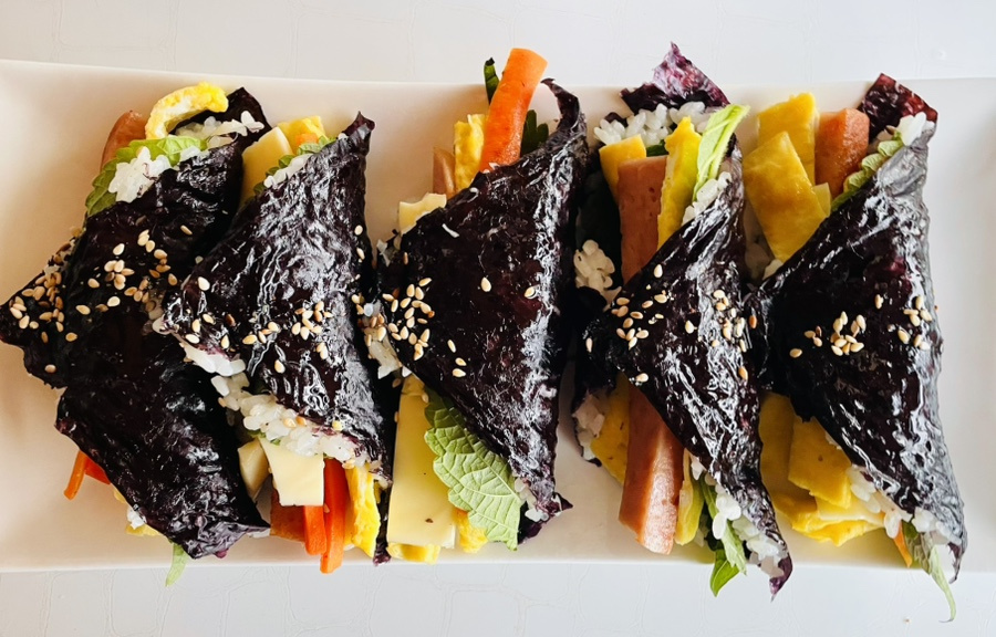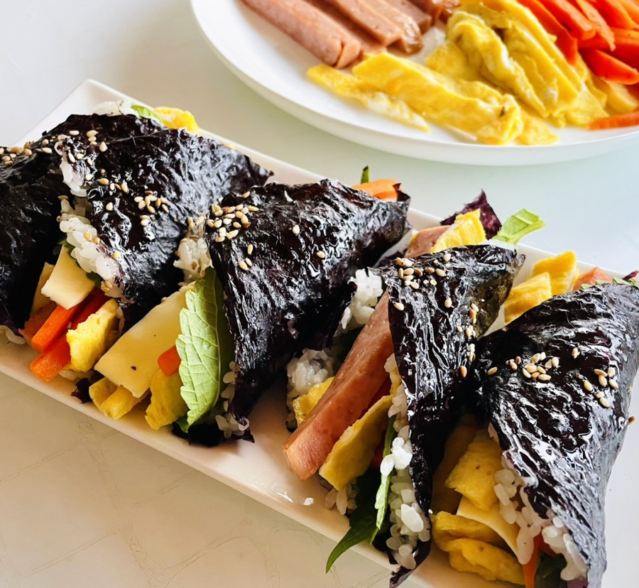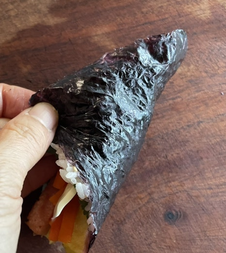 만들어 본 결과 그냥 꼬마 김밥으로 또르르 마는 거랑 세모로 접는 거랑 노동의 강도와 시간적인 효율성에 있어서는 별 차이는 없는 거 같아요.