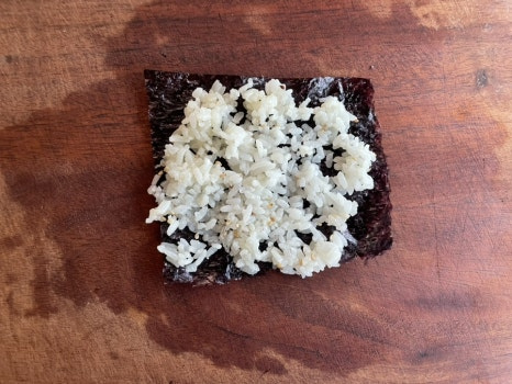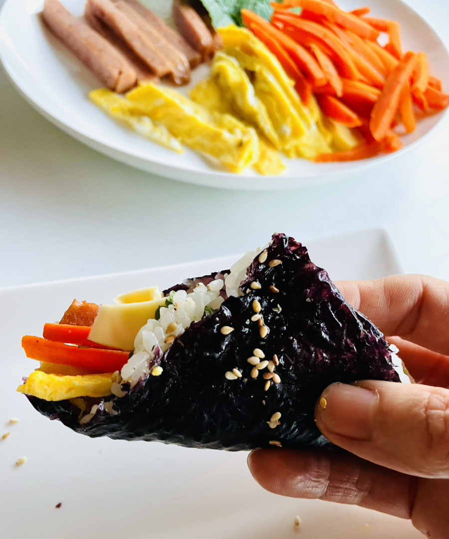 아이들 어렸을 때 구운 김에 밥 싸듯이 정사각형 네모로 자른 김에 밥과 김밥 재료 얹고 반 딱 접에 끝부분 세모 부분을 붙여주면 초간단 삼각김밥이 완성되는 간편 레시피예요.