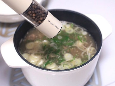 충분히 끓여 감자가 포슬하게 익으면 대파, 후추를 넣어 한소끔 끓여주세요. 부족한 간은 굵은소금으로 해주세요.