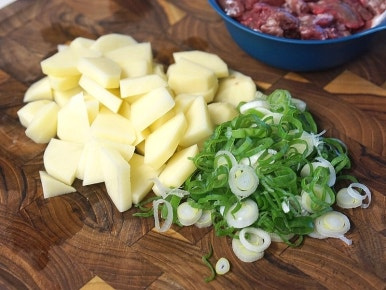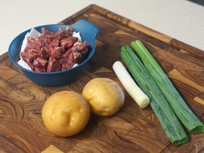 국거리용 소고기 150g, 감자 중사이즈 2개, 대파 2/3대 준비합니다.
