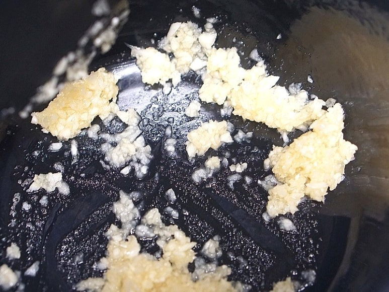 냄비에 참기름 2T, 다진마늘 1T 듬뿍 넣어 마늘의 고소한 향이 올라올 때까지 중약불에서 천천히 볶아주세요.