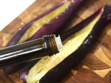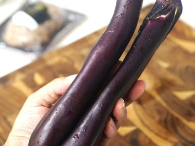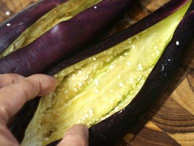 납작해진 가지는 길게 반으로 칼집을 넣어준 후 속을 살짝 벌려주세요.