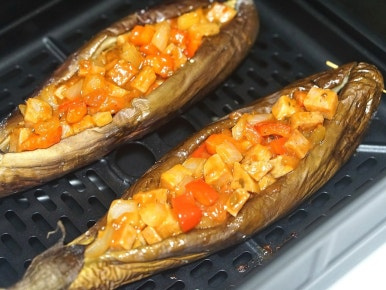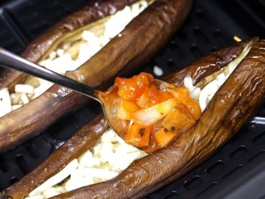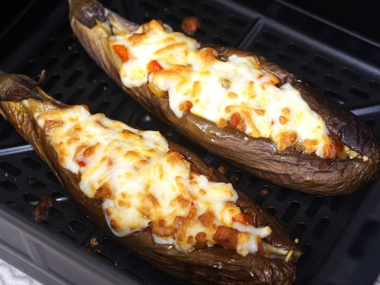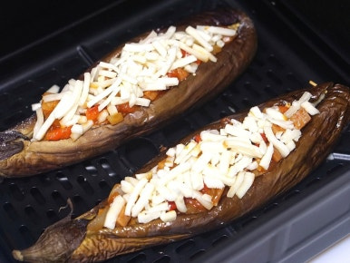 가지가 1차 구워지면 모짜렐라치즈를 적당량 깔고 볶아낸 속재료를 가득 채워주세요. 그리고 치즈를 듬뿍 올려 에어프라이어 190도에서 5분 구워주세요.