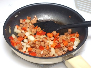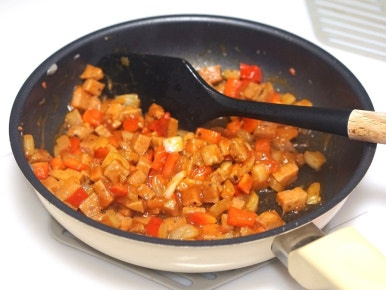 가지가 구워지는 동안 속재료를 볶아주세요. 팬에 오일 2T를 두르고 햄과 양파부터 중불에서 충분히 볶아주세요. 양파가 투명해지면 파프리카를 추가해 짧게 볶아준 후 토마토소스 4T를 넣고 볶아 속재료를 만들어 줍니다.