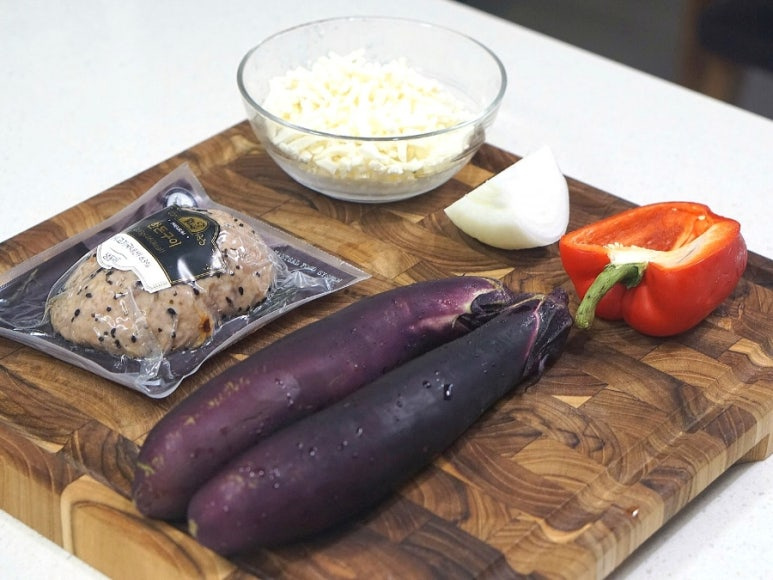 가지 2개, 햄 150g, 양파 1/2개, 파프리카 1/2개, 모짜렐라치즈 130g 준비합니다. 햄 대신 베이컨을 사용해도 좋습니다.