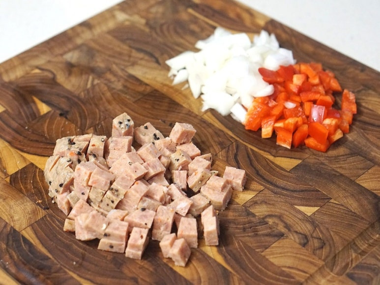 햄과 채소는 잘게 깍둑썰기해 주세요. 재료는 꼭 같을 필요는 없으며 냉장고 사정에 맞춰 준비해 주셔도 좋아요.