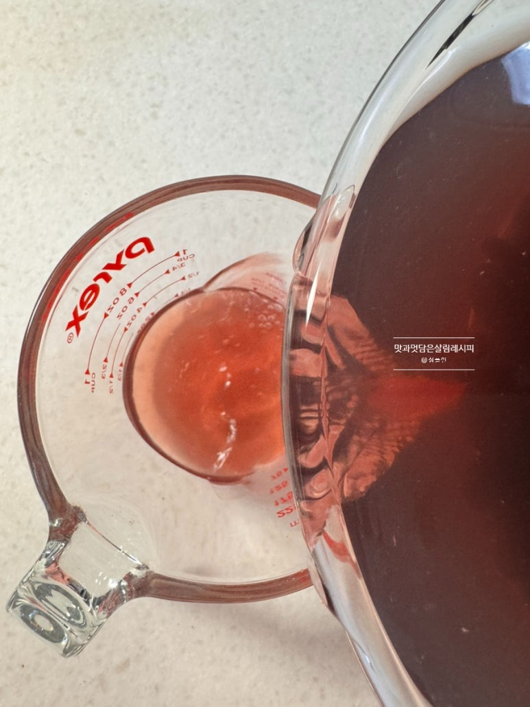 적갈색으로 변한 물은 버리지 않고 끓이며 조려낼 때 사용할 용도로 활용하기 때문에 2컵 따로 따라내줍니다.