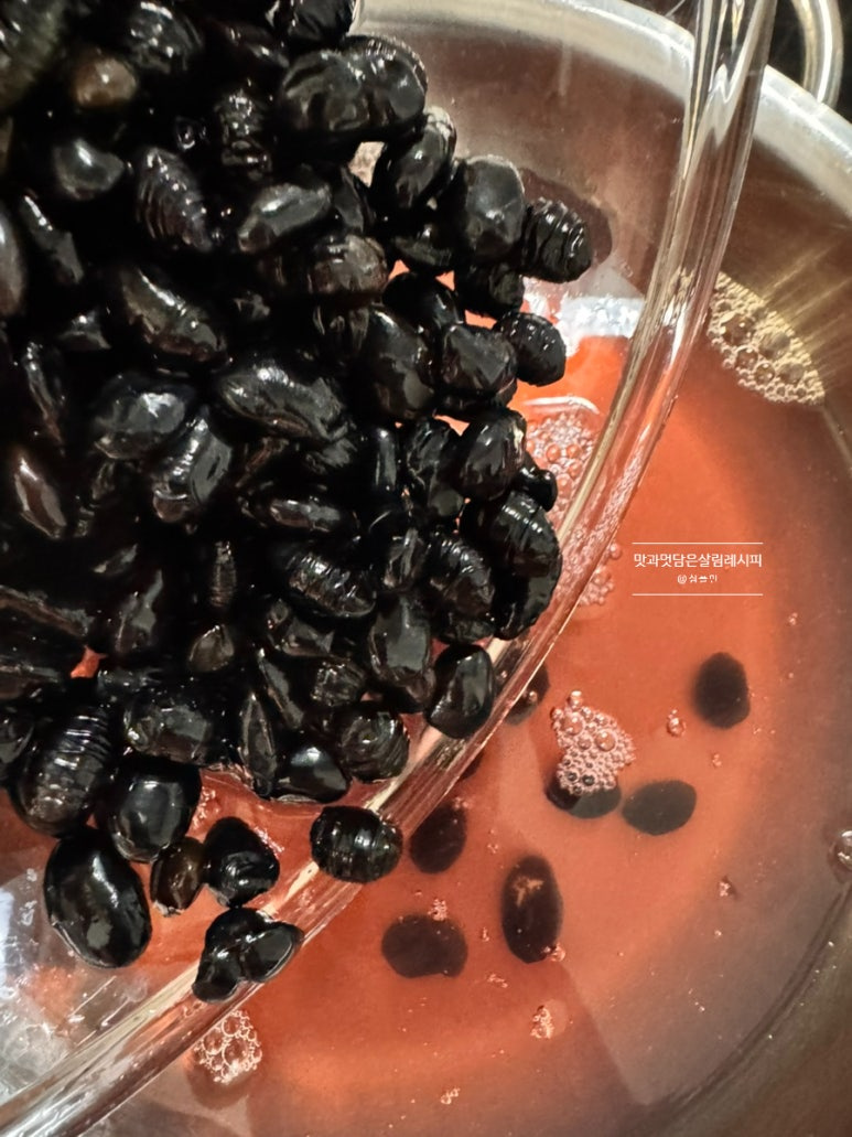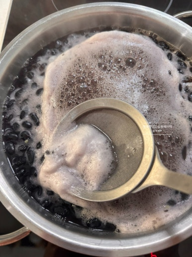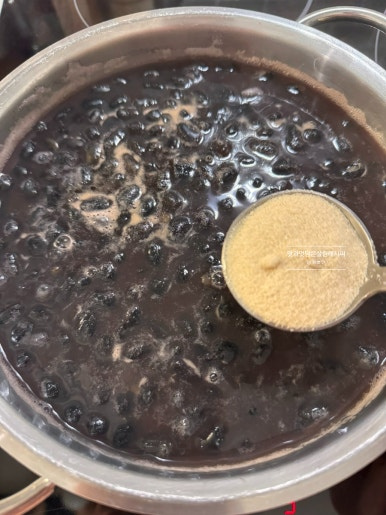 끓일 냄비에 따로 빼 둔 2컵 분량 넣어주고요. 부드럽게 불린 콩도 모두 넣어줍니다.
