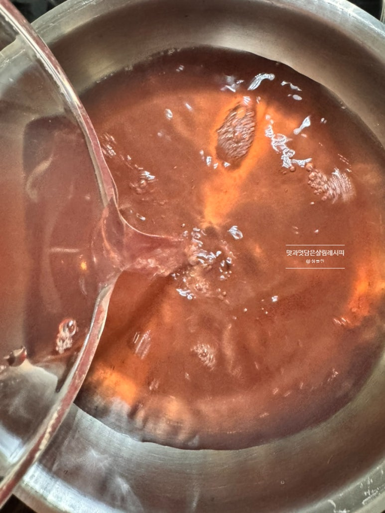 깔끔한 조림을 위해 채로 걷어냅니다. 걷어낸 뒤 5분 정도 보글보글 삶아주듯 끓입니다.