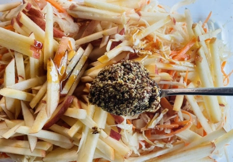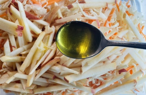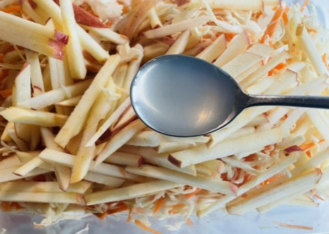 사과가 들어가서 오래 두고 먹으면 수분이 빠지고 신선도가 떨어지니까 라페를 많이 만들거라면 당근 양배추 라페를 먼저 만든 다음 적당량 덜어서 사과랑 믹스하거나 처음부터 하루에 다 먹을 정도의 양만 양배추 당근 사과 넣은 라페를 만드는 걸 추천해요.