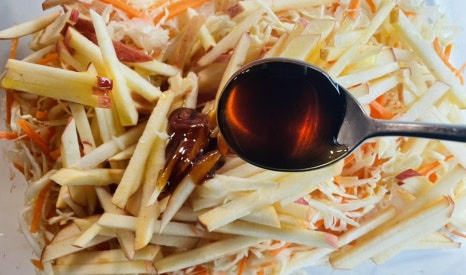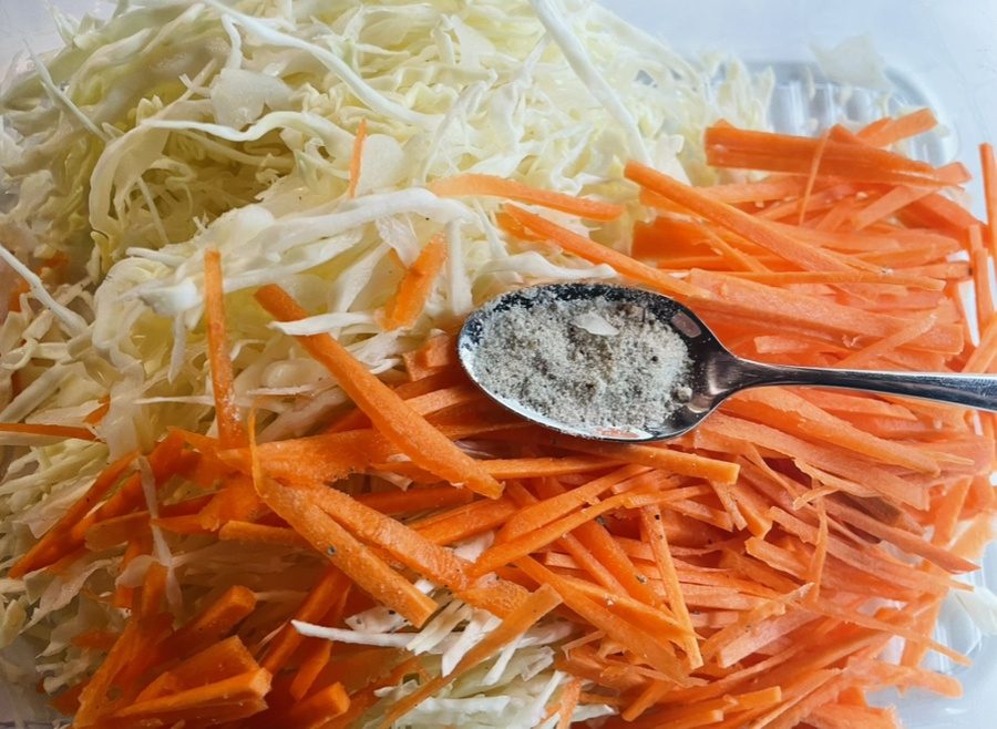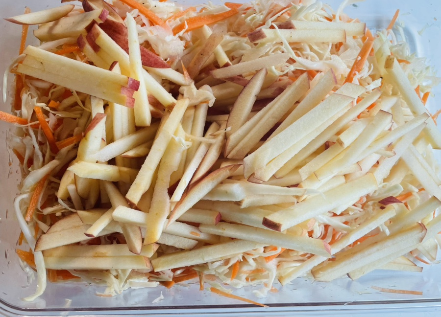 한가지 주의할 점은 양배추와 당근은 어느 정도 강도가 있어서 소금에 살짝 절여 주지만, 사과는 마지막에 썰어 넣고 버무려 주세요.