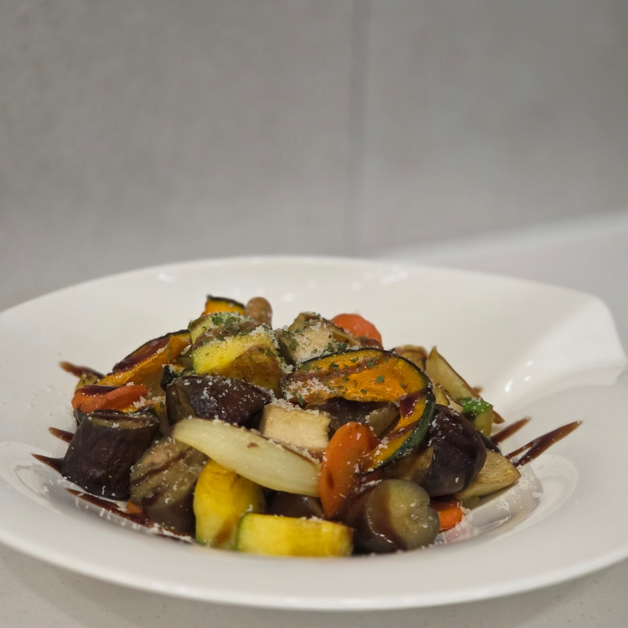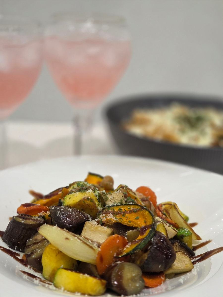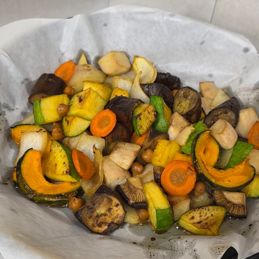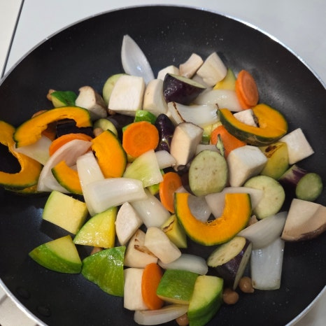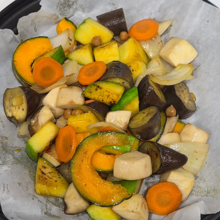 팬에서 다 볶아내도 되지만 저는 다른 요리와 함께 먹을 거라 오븐에 넣어두고 다른 요리하는 동안 더 익혀주었고 야채가 조금 많이 익는 걸 좋아하는 편이라 팬에 조리 후 에어프라이기에서 한 번 더 조리하기도 했습니다. 팬을 사용하지 않을 거면 처음부터 올리브유와 설탕, 카레 가루를 넣고 180도에 30분 이상 익혀주세요.