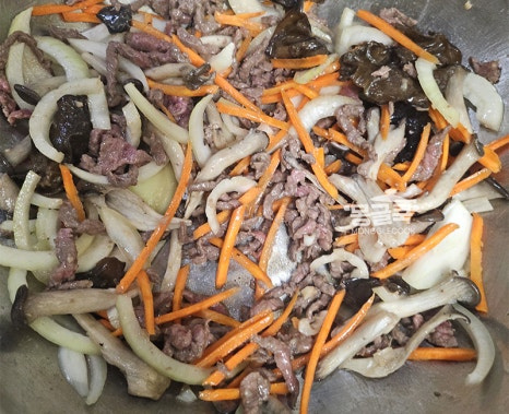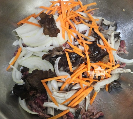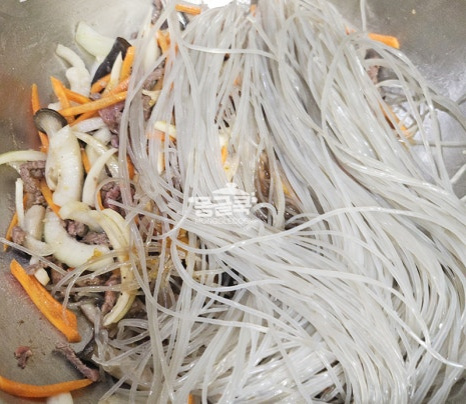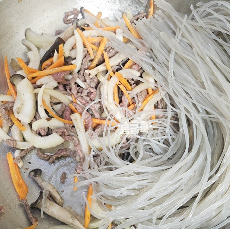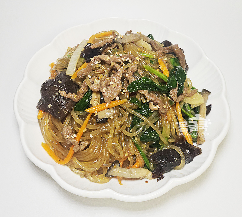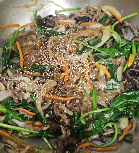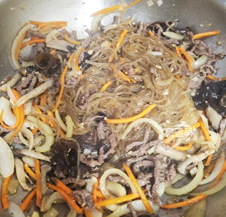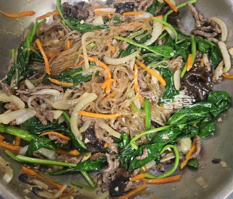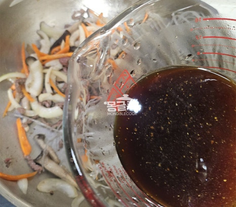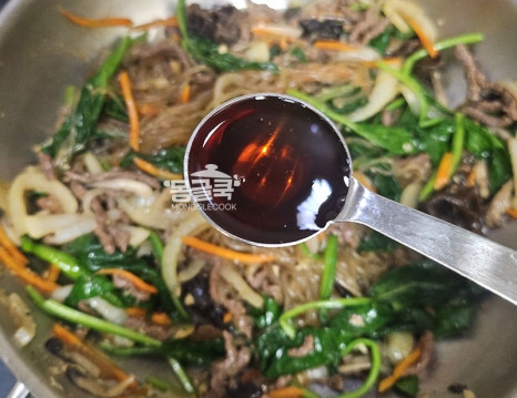 중간에 당면이 바닥에 눋지 않도록 가볍게 뒤적이며 양념이 골고루 스며들게 해주세요.