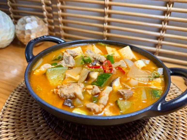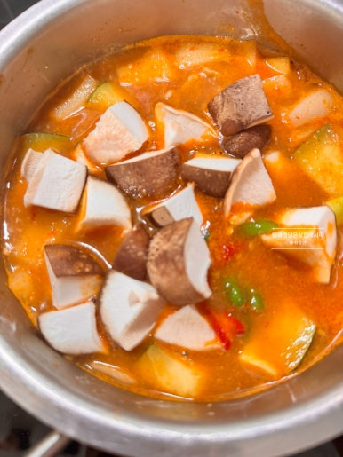 야채 재료는 취향과 준비 상황에 따라 변동하여 만들어 주는데요. 오늘은 애호박 대신 둥근 호박을 넣어주었어요. 버섯은 표고버섯을 활용했지만 팽이나 느타리 등 다양한 품종 아무거나 무방하게 쫄깃한 식감으로 맛있게 만들 수 있습니다.