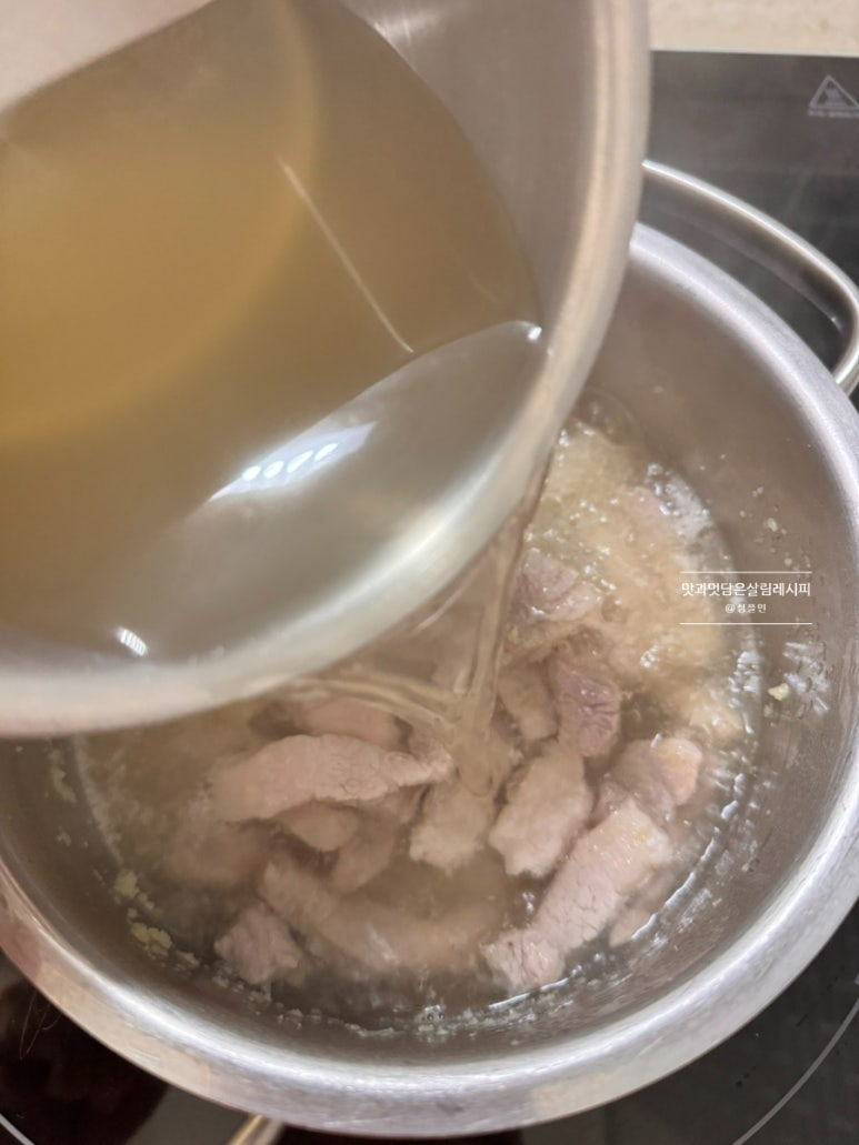 볶은 고기에 끓인 육수 부어주고요.