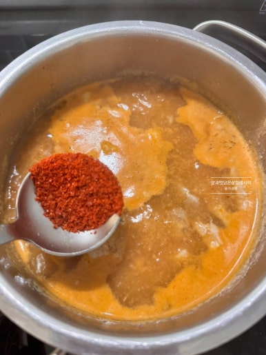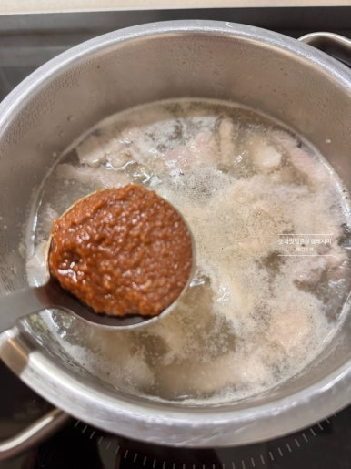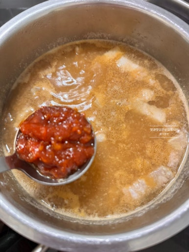 된장 2큰술, 쌈장 1큰술, 고춧가루 반 큰술, 참치액 반 큰술 넣어줍니다. 시판 된장을 활용했는데 사용하는 종류 따라 염도가 다를 수 있기에 참치액은 소량 넣고 부족한 간은 마지막 단계에 맞춰주도록 해요.