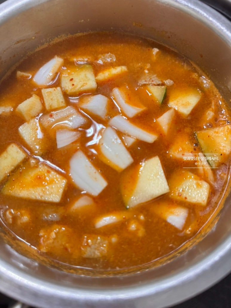 단단한 야채인 호박과 양파 먼저 넣고 뚜껑 닫아 3~4분 보글보글 끓여줍니다.