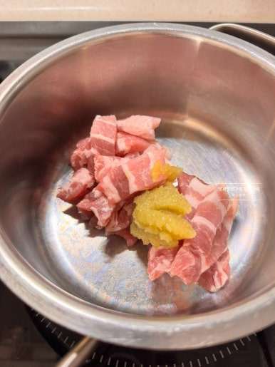 고기는 소고기나 돼지고기 모두 상관없는데요. 차돌박이를 활용해도 좋고 대패삼겹살로 활용해도 좋습니다. 오늘은 돼지고기이지만 대패 대신 일반 삼겹살을 작게 썰어 달달 볶아 고소한 맛 가득 살려주었어요.