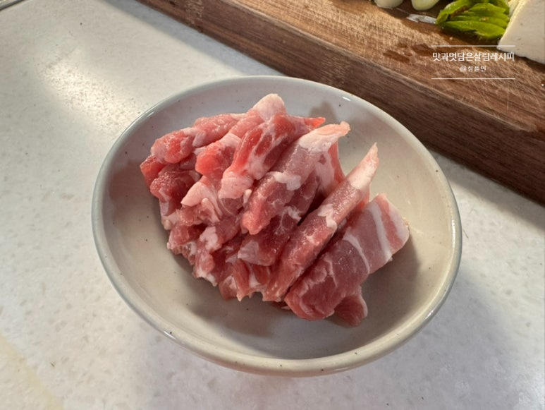 삼겹살 대패 아닌 일반 두께로 잘게 썰어주었어요. 얇은 대패 사용해도 좋습니다.