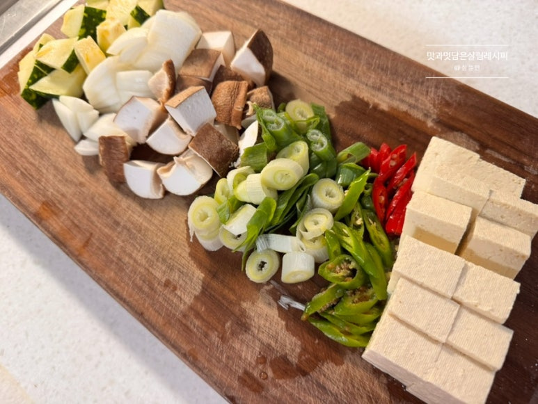 저는 한입 쏙쏙 떠먹기 좋은 크기로 썰었습니다. 집에 둥근 호박이 있어 애호박 대신 활용했고요. 양파는 1/3개, 표고버섯은 2개 밑동 잘라내고 썰었어요. 버섯은 사실 씻지 않고 섭취하는 것이 영양면에서 더 좋다고 하지만 먼지나 이물질 등 찝찝하여 가볍게 씻어주고 있어요.