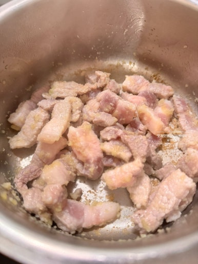 다진마늘 1큰술과 함께 달달 볶아주는데요. 기름기가 많은 부위이기 때문에 따로 기름은 넣지 않았어요. 80% 정도 익을 정도로 볶아 줍니다.