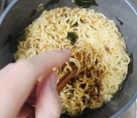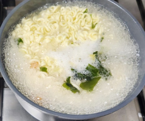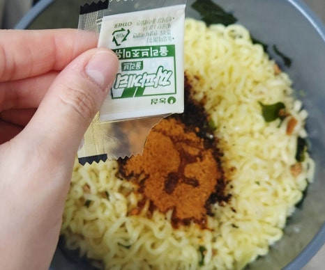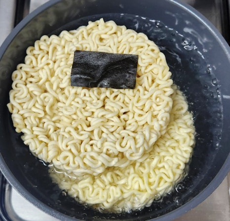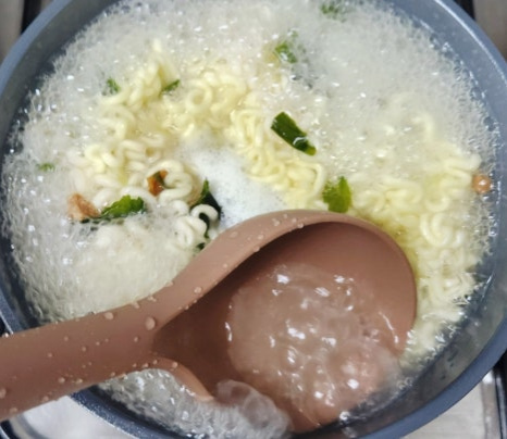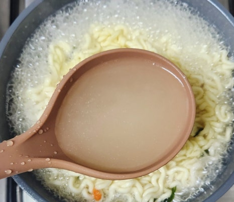 면이 익어갈 즈음 물을 덜어내야 하는데요. 완전히 국물이 없는 비빔라면 스타일이 아니라, 국물이 자작하게 남을 정도가 가장 맛있어요. 대략 국물이 밑바닥에 얇게 깔릴 정도로만 남기면 좋아요. 혹시 국물이 부족할 수도 있기 때문에 면수는 따로 그릇에 담아뒀다가 조리를 하면서 추가해도 좋아요.
