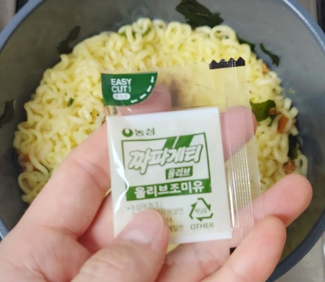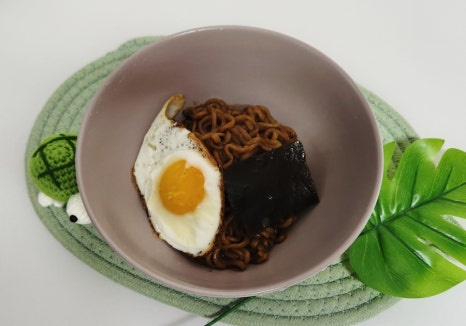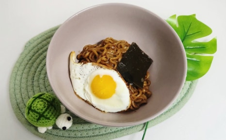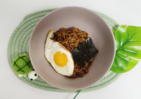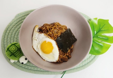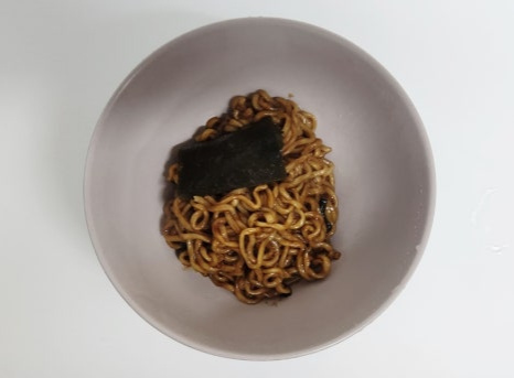준비된 그릇에 짜파구리를 예쁘게 담아 주세요. 그리고 그 위에 다시마를 올리고 계란후라이도 올려 주세요.