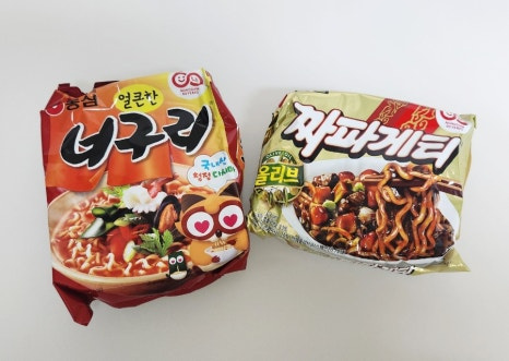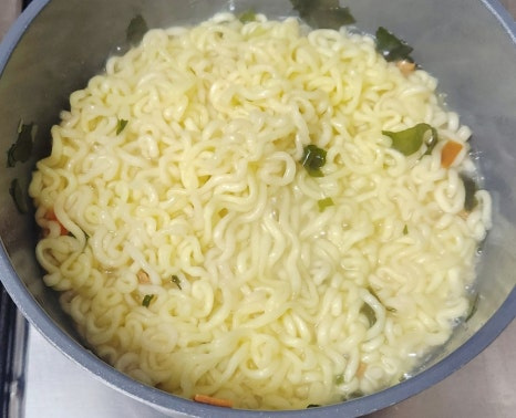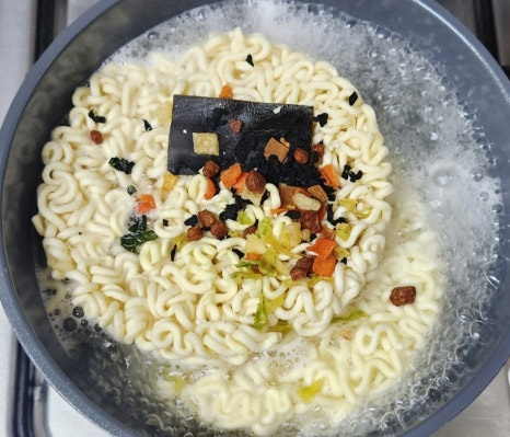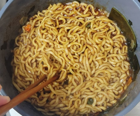 냄비에 물을 약 800ml 정도 넣고 팔팔 끓여주세요. 물이 끓기 시작하면 너구리 면과 짜파게티 면을 넣어 주세요. 그리고 너구리에 들어있는 다시마와 건더기스프를 동시에 넣고 약 5분간 끓여 주세요.