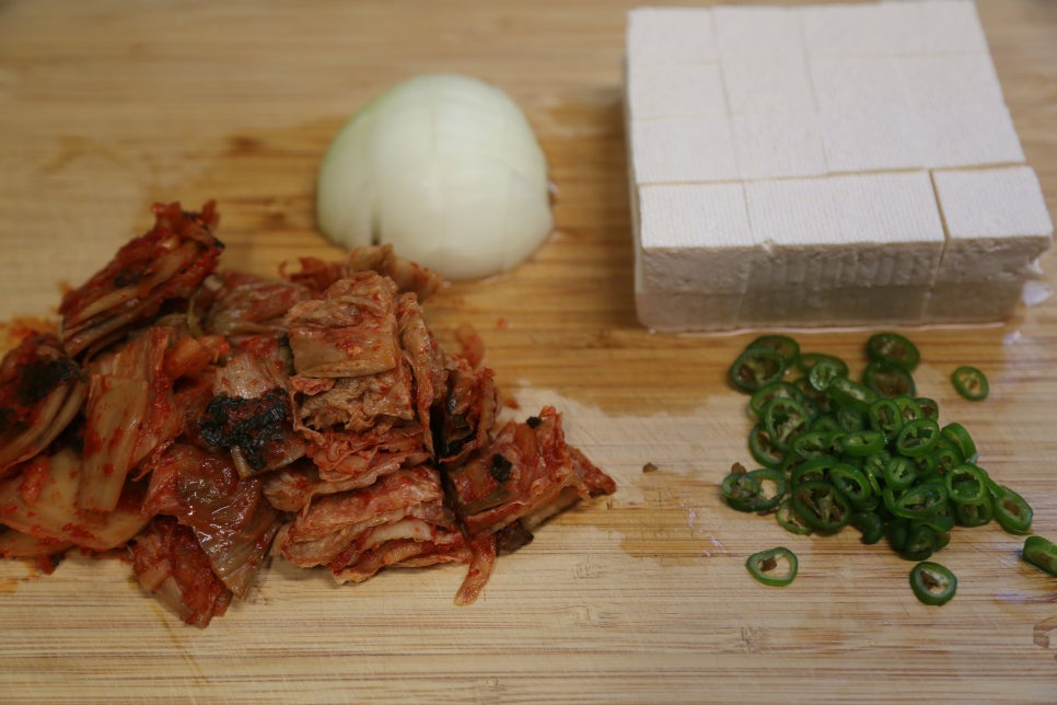 두무 한 모, 김치 300ml, 양파 1/2개, 청양고추 2개