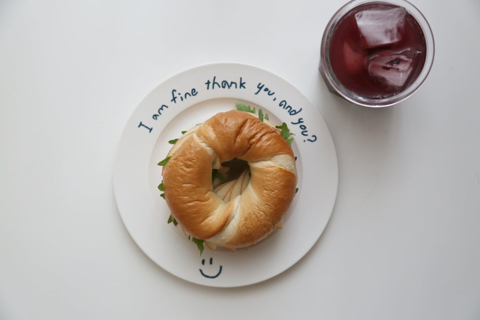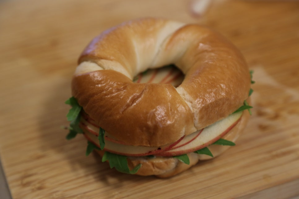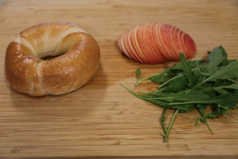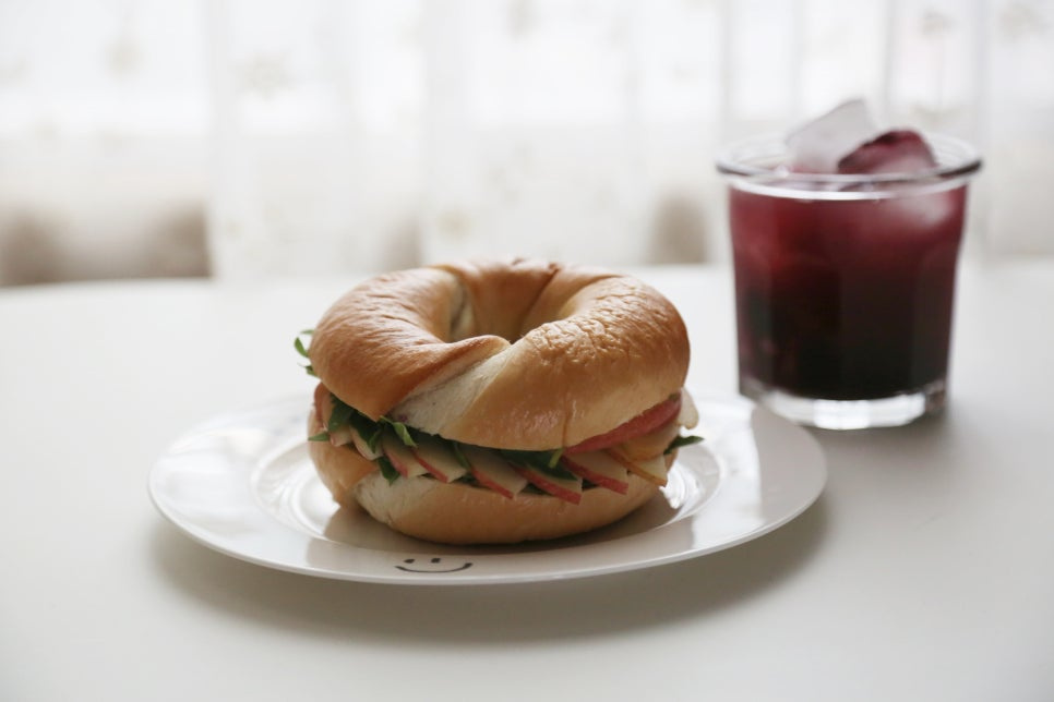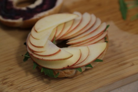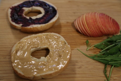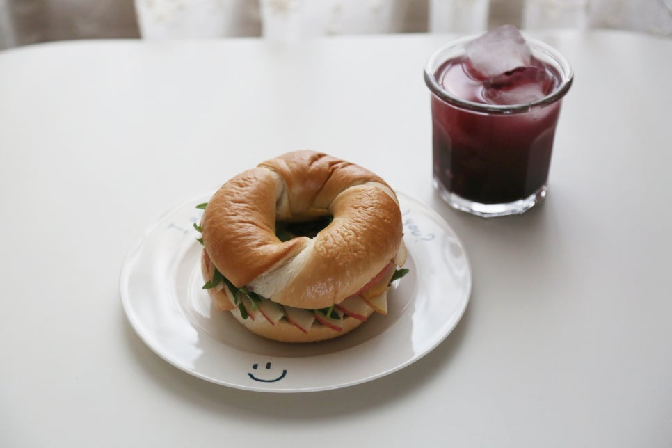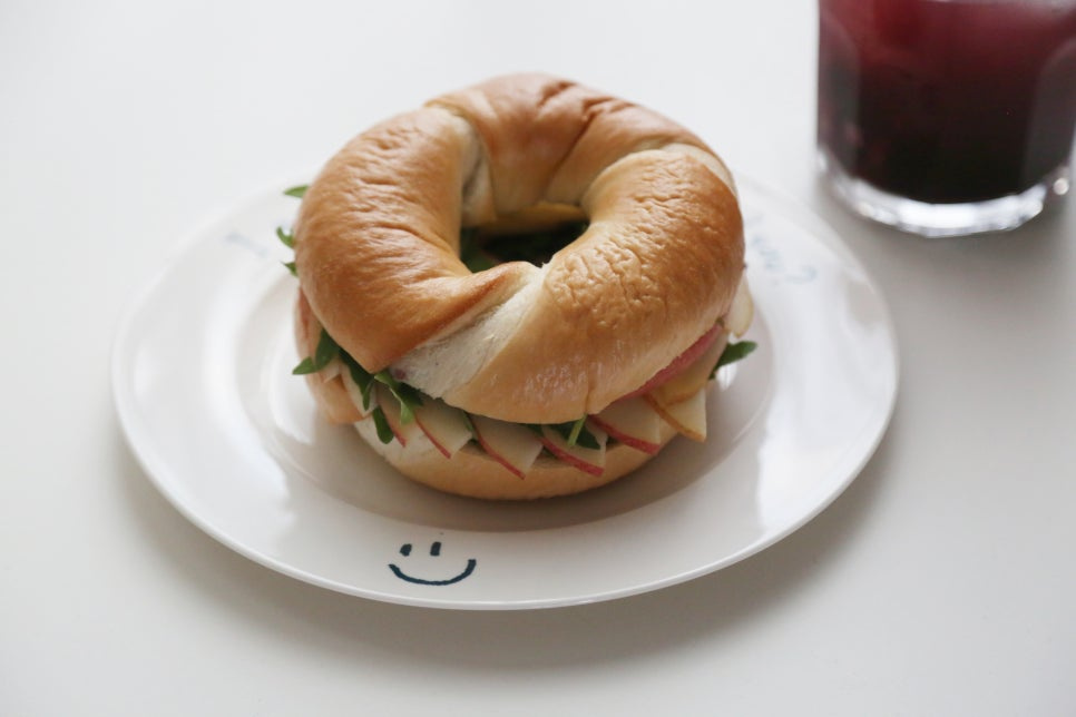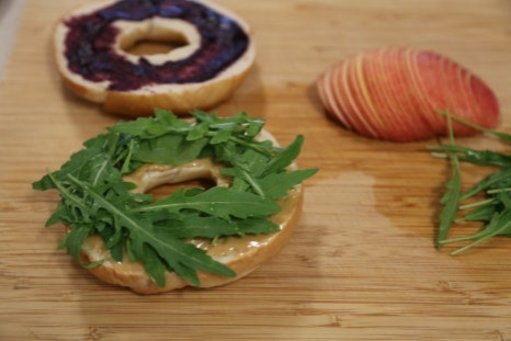 플레인베이글 1개, 루꼴라 한 줌, 땅콩버터 3스푼, 블루베리퓨레 25g